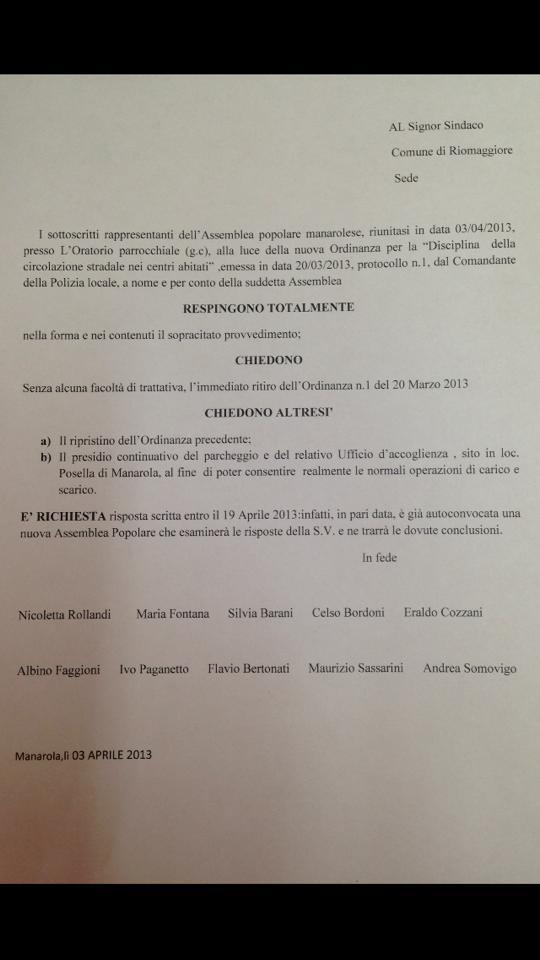 Si pubblica la risposta dell'amministrazione alla richiesta ricevuta da parte del Comitato Traffico di Manarola:
